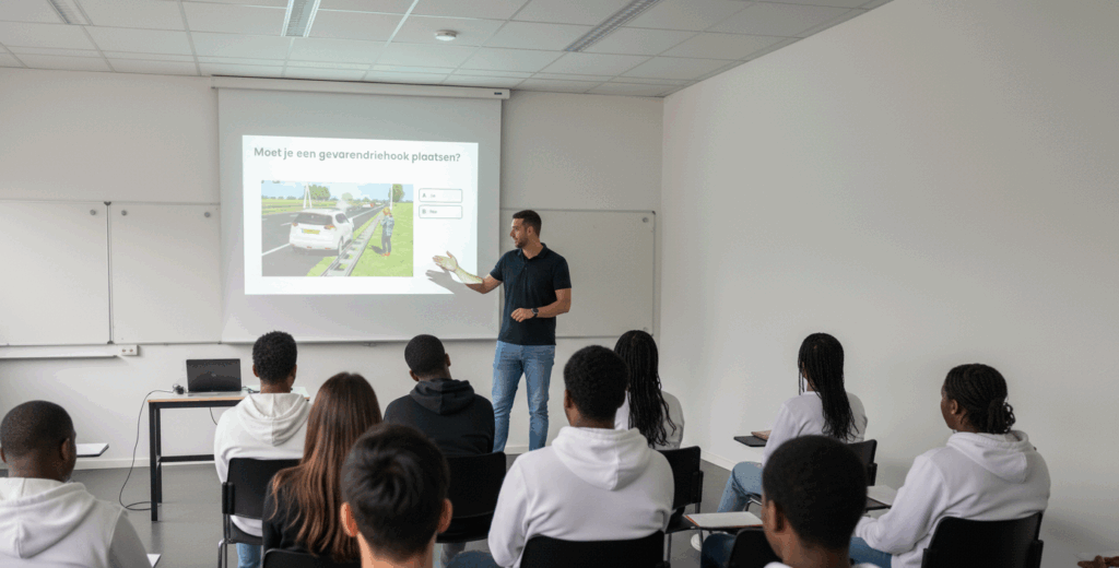 Onze cursussen zijn klassikaal en volledig gericht op het auto theorie examen. We houden de groepen bewust klein zodat er genoeg persoonlijke aandacht is. Hierdoor kun je altijd vragen stellen en krijg je uitleg die echt aansluit bij jouw manier van leren.